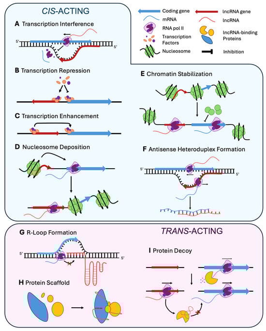 In recent years, fungal lncRNAs have been reviewed, including their proposed mechanisms of action. The reviews are either general [94,95] or specifically focused on yeasts [96,97,98] or antisense lncRNAs [99]. The cases of lncRNAs studied in more detail allow us to sketch a general scenario of the different regulatory mechanisms in which they may be involved. This section may serve as a guide for a better understanding of possible mechanisms for the specific lncRNAs described in Section 4, especially for those in which there is sufficient experimental support.