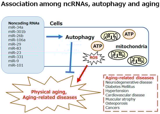 ncRNAs can induce the degradation of mRNAs for the repression of the translation, which could target specific mRNAs through the sequence-specific binding to the 3′ untranslated region (3′UTR) of a mRNA []. In general, the biogenesis of ncRNAs together with miRNAs may start with their transcription in the nucleus [], which is further processed by an RNase enzyme to generate a precursor of the ncRNA []. The precursors of ncRNAs are exported to the cytoplasm to generate a mature ncRNA with the help of another RNase enzyme, DICER []. Some ncRNAs can bind to its specific target mRNA to form the RNA-induced silencing complex (RISC) []. In these ways, some ncRNAs could regulate the mRNAs related to autophagy []. Certain ncRNAs have been shown to be upregulated in age-associated diseases, such as Parkinson’s disease []. In particular, an increased expression of miR-301b, miR-26b, and miR-106a can regulate autophagy, which might aggravate the alpha-synuclein pathology of Parkinson’s disease []. These ncRNAs could also regulate protein folding, which could serve as potential therapeutic targets for protein misfolding in several age-associated diseases. Autophagy may also play an imperative role in the pathogenesis of aging-related macular degeneration that has the harmful aggregation of damaged proteins in retinal cells. In C. elegans, secreted ncRNAs such as miR-29 and/or miR-83 could improve the aging-related decrease in autophagy throughout different tissues for longevity []. Additionally, loss-of-function mutations in miR-34 can significantly extend the lifespan, which has been shown to bind with the autophagy-related mRNA []. Some ncRNAs are also known to play roles in ultraviolet ray A (UVA) and ultraviolet ray B (UVB)-induced photo-related aging in skin fibroblasts by regulating autophagy []. In this case, the level of miR-23 might be upregulated during skin exposure to UVA/B irradiation, which is a positive regulator of autophagy in skin []. Inhibition of miR-23 could stimulate the activation of autophagy, which might protect the skin fibroblasts from UVA/B-induced cellular senescence []. The knockdown of miR-23 is known to increase autophagy in lens epithelial cells, which might alleviate oxidative stresses in the lens []. As a result, miR-23 may play a role in the age-associated increase in oxidative stresses in lens epithelial cells, where one of the major causes of eye cataracts with aging might occur. The inhibition of miR-331-30 and miR-9-5p has been shown to prevent the progression of Alzheimer’s disease by activating the autophagy essential for the clearance of amyloid beta proteins []. It has been shown that miR-331-3p and miR-9-5p can affect autophagy receptors, which could act as potential markers of Alzheimer’s disease []. Another miRNA, miR-101, could also inhibit autophagy. A reduction in miR-101 has been reported in the hippocampus with Alzheimer’s disease []. Mimicking the age-associated loss of miR-101 in hippocampal neurons can cause cognitive decline in the model mice of Alzheimer’s disease [] (Figure 1).
