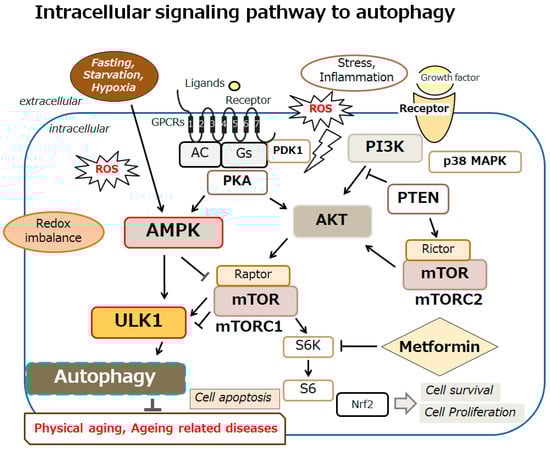 Adenosine monophosphate-activated protein kinase (AMPK) might be governing in a corresponding intracellular signaling network, sustaining the homeostasis of cells []. In particular, AMPK can adjust an energy requirement by approving the ATP production and by regulating the ATP consumption in cells [,]. The AMPK can be involved in directing an inhibitory signaling pathway with the mechanistic/mammalian target of rapamycin (mTOR), which may effectively decrease apoptosis by regulating autophagy []. Also, AMPK can start the autophagy via the autophagy activating kinase 1 (ULK1) [,]. Activation of aserine/threonine kinase ULK1 is an initiation for the formation of phagophores, which are then extended to autophagosomes []. The AMPK and mTOR complex 1 (mTORC1) can work as the key mTOR antagonists controlling the ULK1 activity []. Via external growth factor stimulation and following the activation of PI3K/AKT and AMPK signaling, mTORC1 could control the phosphorylation and/or the activation of the ULK1 [] (Figure 2). Therefore, AMPK may be a key regulator in several oxidative stresses for maintaining energy homeostasis, which might be recognized as an energy sensor as a result of its critical roles [,]. Remarkably, it is well known that AMPK can provide several protective effects in various cells by governing energy homeostasis. In addition, AMPK can organize several cellular key processes, including protein synthesis, DNA repair, and cell differentiation/proliferation [,]. As a result, AMPK could accomplish cell protection, which can respond to many cell damages, including oxidative stress []. These vital roles of AMPK in cells/tissues/organs may be indispensable for maintaining the physiological/pathological situation [,]. Unquestionably, the regulation of AMPK may play a substantial role for achieving longevity. Physical aging can be renovated by modulating the AMPK signaling pathway, corresponding with the alteration of autophagy [].