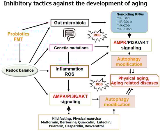 Schematic demonstration of the potential inhibitory tactics against the development of physical aging and/or aging-related diseases. Example implements including metformin treatment and several nutraceuticals dieting as well as mild fasting/physical exercise known to act on the autophagy modification are also shown. Note that some significant activities such as inflammatory responses and/or reactive oxygen species (ROS) production from inflammatory conditions have been misplaced for clarity. Some probiotics and/or fecal microbiota transplantation (FMT) could support the positive modification of gut microbiota for the improved autophagy via the alteration of non-coding RNA production, which might also be advantageous for the treatment of physical aging and/or several aging-related diseases.