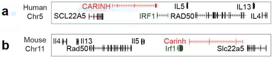 Synteny analysis comparing human and mouse genomes has identified that CARINH is one of the rare human lncRNAs that has a mouse ortholog, known as Carinh—also referred to as Gm12216—located on mouse chromosome 11. This mouse ortholog is similarly positioned antisense to the mouse Irf1 gene and in genomic vicinity to Il-4, Il-13, Il-15, Rad50, and Slc22a5 (Figure 1b) [22,23]. The presence of a mouse ortholog to CARINH presents a unique opportunity to explore its functions in vivo using Carinh knock-out mice, as demonstrated in inflammatory bowel disease and viral infection [22,23]. A deeper exploration of the regulatory functions of this specific lncRNA and its mouse ortholog, situated in a locus encompassing crucial genes for inflammatory signaling, may reveal essential mechanisms underpinning cellular responses and potentially influence clinical outcomes.