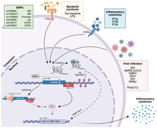 Figure 2. CARINH is a central regulator of innate and autoimmune inflammatory responses. CARINH expression is triggered by diverse environmental and cellular stimuli, including inflammatory cytokines, bacterial and viral products, and viral infections. CARINH acts as a cis-regulatory lncRNA that promotes IRF1 transcription through interaction with chromatin regulators such as CBP/p300. Elevated IRF1 levels drive the expression of ISGs contributing to antiviral and inflammatory responses. Genetic variants (SNPs) within the CARINH locus are associated with several immune-mediated disorders, including inflammatory bowel disease (IBD), psoriasis, juvenile idiopathic arthritis (JIA), and chronic obstructive pulmonary disease (COPD), highlighting its relevance in immune homeostasis. CRISPR/Cas9-mediated disruption of the CARINH locus impairs IRF1 transcription and downstream ISG induction, underscoring the enhancer-like regulatory function of CARINH in controlling innate immune gene expression. Solid arrows indicate established mechanisms, dashed lines indicate mechanisms that are postulated based on published data.