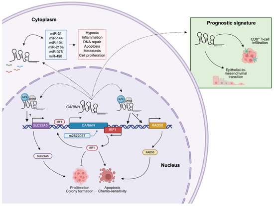 Figure 3. CARINH modulates cancer-associated pathways, thereby attenuating tumor development. CARINH expression is found in a variety of cancers, such as esophageal cancer, bladder cancer, leukemia, and breast cancer. CARINH can exert control within its locus, such as on IRF1, RAD50, and SLC22A5, which in turn control key pathways in cancer growth. In the cytoplasm, CARINH acts as a competing endogenous RNA on a set of microRNAs associated with pathways linked to tumor cell proliferation and metastasis. CARINH has been shown to be part of the prognostic signature driving epithelial-to-mesenchymal transition and CD8+ T-cell infiltration. Solid arrows indicate established mechanisms, dashed lines indicate mechanisms that are postulated based on pulished data.