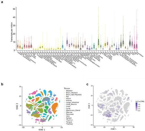 Figure 4. (a) Violin plot detailing the expression in transcripts per million of CARINH in 54 different human tissues. Data is provided by the National Institutes of Health Adult Genotype Tissue Expression Project. Data is derived from RNA-sequencing of 17,382 samples, 948 donors. (b) t-Stochastic neighbor embedding (t-SNE) visualization of all cells collected by Tabula Maris, colored by organ. (c) t-SNE visualization from (b) overlaid with dots showing level of Carinh expression (color scale) within each organ. Data is derived from Tabular Maris. This data includes 53,760 cells from 20 tissues from 8 mice.