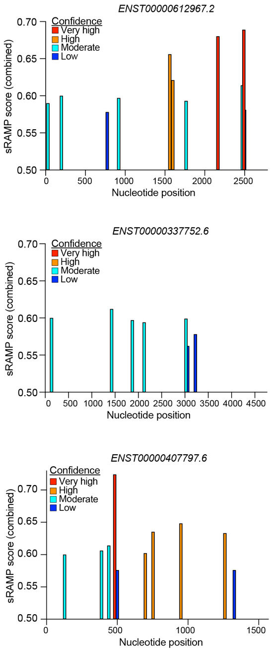 Figure 6. sRAMP prediction of methylation sites within the three human variants of CARINH. Colors indicate confidence scores.