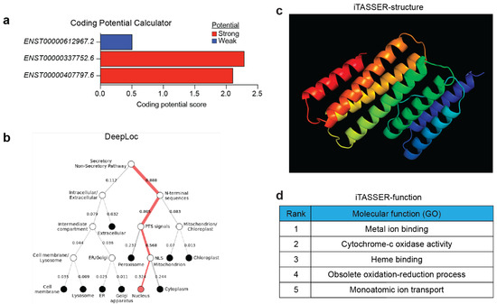 Figure 7. (a) Bar graph representing coding potential of three CARINH splice variants, as calculated by Coding Potential Calculator. Colors indicate strong/weak potential. (b) Hierarchical tree of predicted subcellular localization of a putative peptide present in CARINH as predicted by DeepLoc. (c) iTASSER predicted structure of a putative peptide present in CARINH. (d) iTASSER predicted molecular function of a putative peptide present in CARINH.