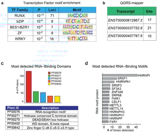 Figure 8. (a) HOMER analysis of regions bound by CARINH, showing transcription factor families with lowest p-value, number of loci, and transcription factor binding motif. p-values calculated using a binomial test. (b) Table denoting number of unique G-quadruplexes (G4s) found using QGRS mapper in each of the CARINH splice variants. (c) Identified RNA-binding domains in proteins predicted to bind CARINH predicted by catRAPID. (d) List of proteins containing most RNA-binding motifs that are predicted to bind CARINH detected by catRAPID.