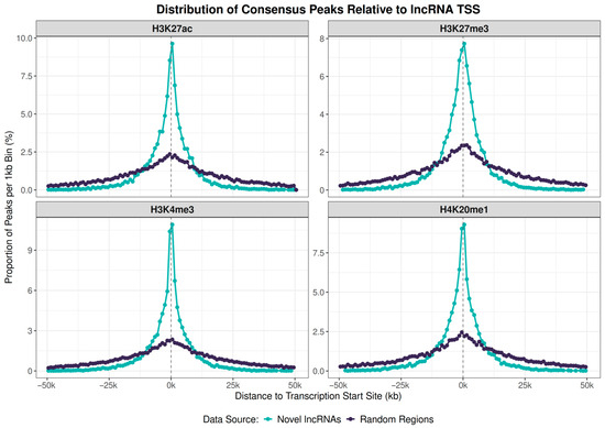 A two-sample Kolmogorov–Smirnov test confirmed that the distribution of peaks around novel lncRNA TSSs is significantly different from the random control for all four marks (H3K27ac D = 0.221, H3K27me3 D = 0.222, H3K4me3 D = 0.225, H4K20me1 D = 0.216; all p < 0.001). Thus, the majority of novel lncRNAs have regulatory marks near their promoters, following the same profile as previously known lncRNA and protein-coding genes [21].