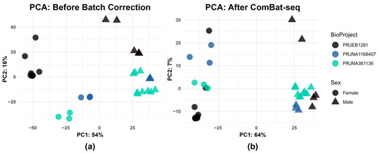 Principal component analysis of RNA-seq samples from S. mansoni adult male and female parasites before (a) and after (b) batch correction to remove BioProjects bias. Symbol shapes indicate the sex of parasites, with circles representing female parasites and triangles representing males. Symbol colors indicate the different BioProjects, which are identified in the legend at right. After batch correction (b), PC1 accounts for 64% of the total variance, clearly separating samples by sex. PC2 accounts for 7% of the variance. Each point represents a single sample within a given BioProject.