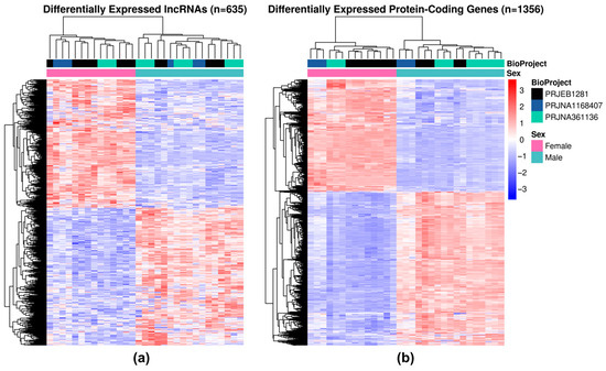 Using a cutoff of adjusted p-value < 0.05 and |log2FC| ≥ 1.5, DESeq2 identified 1991 differentially expressed genes (DEGs), including 635 lncRNAs, with 296 being known lncRNAs (123 LINCs, 152 LNCAs and 21 LNCSs) and 339 novel lncRNAs (150 LINCs, 155 LNCAs and 34 LNCSs). Heatmap visualization of DEGs between adult male and female parasites revealed that 329 lncRNA DEGs (Figure 8a) and 784 protein-coding DEGs (Figure 8b) were upregulated in males (1113 transcripts in total) while 306 lncRNAs and 572 protein-coding transcripts were upregulated in females (878 transcripts in total).
