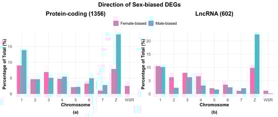 We also analyzed the direction of sex-biased DEGs by investigating chromosomal distribution to determine how male and female DEGs are allocated across the genome (Figure 10). By calculating the proportion of the total sex-specific DEGs assigned to each chromosome, we observed an asymmetry on the Z chromosome. Consistent with the ZZ/ZW sex-determination system, Z-linked DEGs were overwhelmingly male-biased (18.8% of protein-coding and 22.4% of lncRNAs).