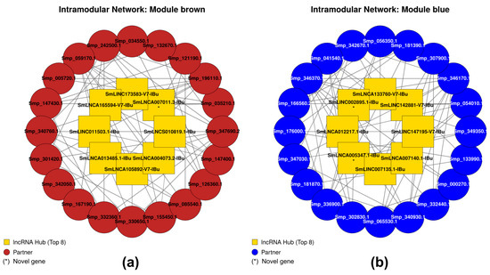 To visualize the functional context of these regulators, we constructed intramodular sub-networks for modules containing lncRNA hubs. Seven of these modules were significantly associated with the ‘Sex’ trait (brown, black, blue, yellow, red, green, and turquoise). In the male-associated brown module (Figure 13a), the novel lncRNA hub SmLNCA007011.3-IBu was categorized as a central node with a high-confidence connection (adjacency = 0.942) to the protein-coding gene Smp_035210. This partner gene plays a critical role in muscle structure development and actin cytoskeleton organization.