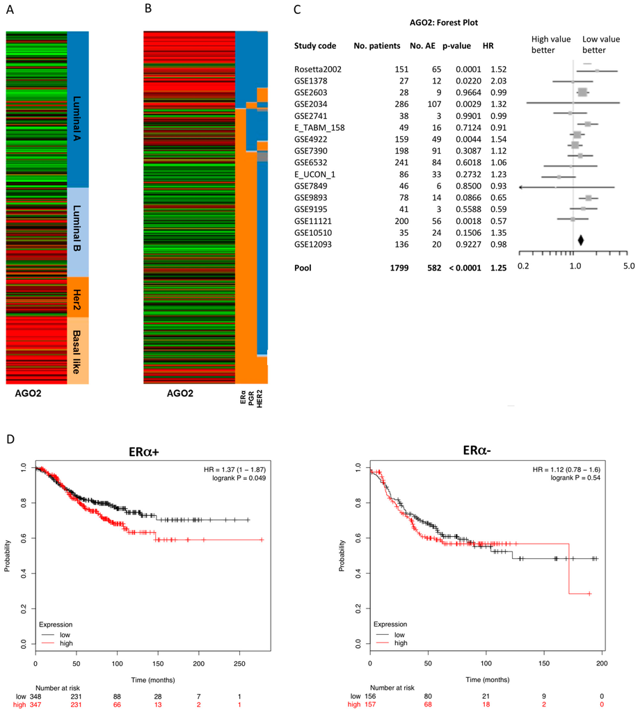 Figure 1. Argonaute 2 (AGO2) expression correlates with poor prognosis in estrogen receptor alpha positive (ERα+) breast cancer tumor samples. RNA deep sequencing of The Cancer Genome Atlas (TCGA) breast cancer samples were analyzed for AGO2 expression in correlation with (A) molecular subtype and (B) receptor status based on clinical scoring. Red indicates high gene expression levels and green indicates low gene expression. For receptors ERα, PGR, and HER2, orange shows positive and blue shows negative receptor expression; (C) Forest plot of univariate Cox analysis of AGO2 expression in breast tumor samples, correlation of AGO2 expression and clinical outcome; (D) Kaplan–Meier analysis of AGO2 expression in ERα+ and ERα− tumor samples with correlation with recurrence free survival for pooled breast cancer samples obtained from Breast Cancer Gene-Expression Miner v3.0. AE: number of events associated with survival, death or relapse; HR: hazard ratio.
