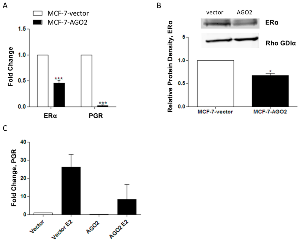 Figure 2. AGO2 expression suppresses ERα function in vitro. (A) MCF-7-AGO2 cell line was analyzed by quantitative PCR (qPCR) for ERα and progesterone receptor (PGR) expression levels vs. MCF-7-vector, n = 3 biological replicates; (B) Western blot for ERα protein levels in the MCF-7-AGO2 cell line, n = 3 biological replicates; (C) qPCR for PGR gene expression levels in MCF-7-AGO2 cell line vs. vector following 24 h of stimulation with 1 nM E2, n = 4 biological replicates. Significantly different * p < 0.05, *** p < 0.001.