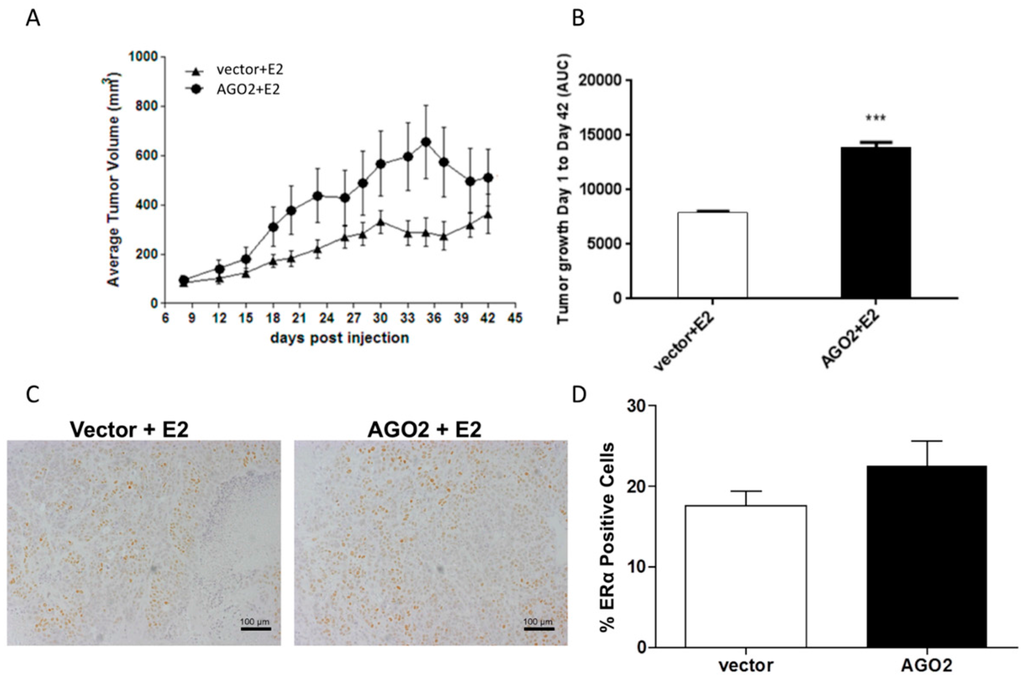 Figure 3. AGO2 enhances estrogen stimulated tumorigenesis in vivo. (A,B) Immunocompromised mice were inoculated with either 5 million MCF-7-vector or MCF-7-AGO2 cell lines in the presence of 60-day release estrogen pellet. (A) Results represent average tumor volume; (B) Results represent area under the curve (AUC). For all experiments error bars represent standard error of the mean (SEM), n = 10 for vector and n = 9 for AGO2 biological replicates. Significantly different *** p <0.001 (C) Tumors derived from MCF-7-AGO2 and MCF-7-vector inoculated mice were stained for ERα expression with immunohistochemistry, images obtained at 10× magnification. (D) Graphical representation of ERα staining from tumor samples, error bars represent SEM.