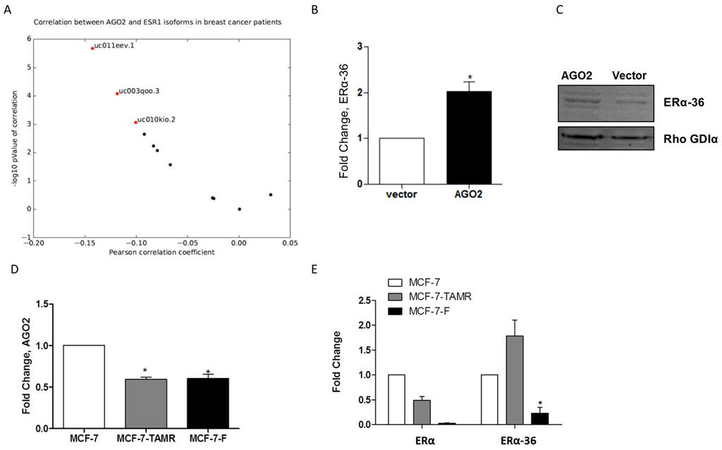 AGO2 increased E2-stimulated tumorigenesis in vivo and this may indicate that AGO2 mediates components of the estrogen signaling pathway. To identify possible mechanisms for the enhanced E2 response observed in vivo, we analyzed TCGA ERα positive breast cancer samples for a correlation of expression between AGO2 and ERα transcript gene expression. Of all evaluated transcripts, three ERα transcripts demonstrated a significant correlation with AGO2 expression. The most significantly correlated transcript with AGO2 gene expression was truncated three exon long ERα transcript (Figure 4A). Next, we examined expression of the truncated ERα splice variant ERα-36 in the MCF-7-AGO2 cell line. Quantitative polymerase chain reaction (qPCR) demonstrated that ERα-36 expression levels were significantly increased in the MCF-7-AGO2 cell line compared to vector control (Figure 4B). Western blot analysis for ERα-36 protein expression demonstrated increased ERα-36 expression in the MCF-7-AGO2 cell line versus vector (Figure 4C). ERα-36 is associated with tamoxifen resistance in breast cancer cells that exhibit resistance to endocrine therapies [10]. To further determine if a correlation exists between AGO2, ERα-36, and endocrine resistance, we next evaluated expression of AGO2 in the tamoxifen and ICI 182,780 resistant cell lines, MCF-7-TAMR and MCF-7-F respectively. Surprisingly, qPCR results demonstrated a loss of AGO2 gene expression in both the MCF-7-TAMR and MCF-7-F cell lines (Figure 4D). Evaluation of ERα and ERα-36 gene expression in these endocrine resistant cell lines demonstrated that ERα is repressed in both cell lines (in accordance with previously published data) and ERα-36 is deregulated in endocrine resistant cell lines [27]. ERα-36 demonstrated elevated expression in the MCF-7-TAMR cell line while it was repressed in the MCF-7-F cell line (Figure 4E). These data suggest there is not a universal correlation between AGO2 and endocrine resistance.