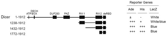 - Ma, E.; MacRae, I.J.; Kirsch, J.F.; Doudna, J.A. Autoinhibition of human Dicer by its internal helicase domain. J. Mol. Biol. 2008, 380, 237–243. [Google Scholar] [CrossRef] [PubMed]