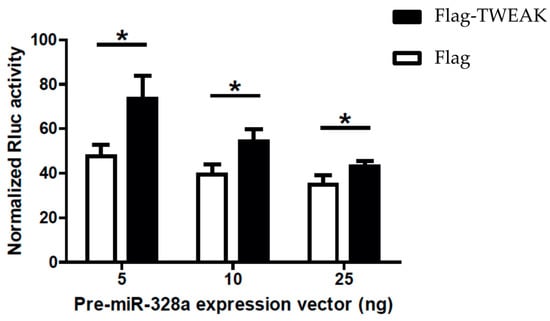 The modulatory effects of TWEAK on the pre-microRNA processing activity of Dicer led us to ask whether TWEAK could influence microRNA-guided RNA silencing. To answer this question, we employed a dual-luciferase reporter gene activity assay in transiently transfected HEK 293 cells, in which silencing of Rluc gene expression is induced by a pre-microRNA substrate, as previously described [15]. Expression of pre-miR-328a in mock-transfected cells induced silencing of a Rluc reporter gene coupled with three copies of a natural binding site for miR-328a (Figure 5, Flag data), as reported previously [10,16,17,18]. Co-expression of Flag-TWEAK slightly impaired Rluc reporter gene silencing induced by pre-miR-328a (Figure 5, Flag-TWEAK vs. Flag data).