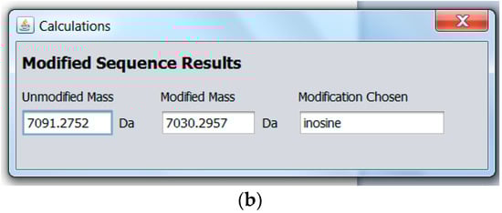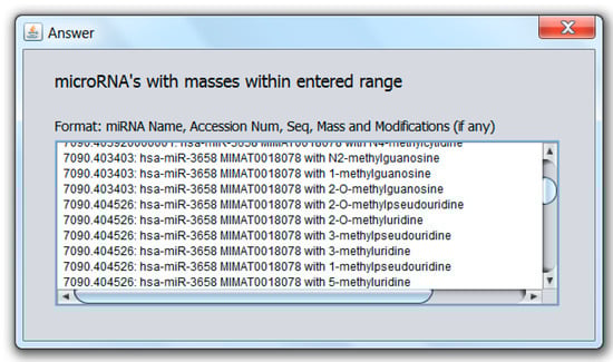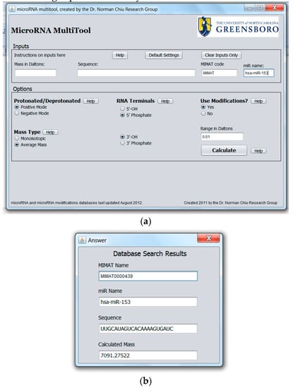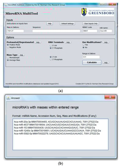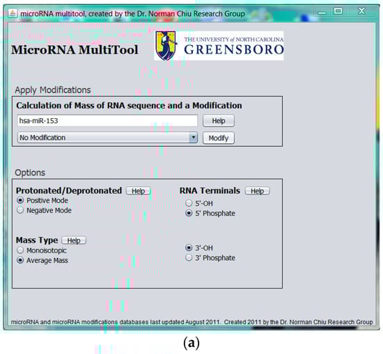 The purpose of the miRNA search and mass calculator function is to match the data obtained from a mass spectrometric measurement to all known human miRNA. This feature is especially important when miRNA are to be identified from mass spectral data with no other information available. The graphical user interface for miRNA search and mass calculator and its output are shown in Figure 2a,b, respectively. In the interface shown in Figure 2a, the “Mass in Daltons” field accepts numerical values and is provided for searching modified or unmodified miRNA. To search for the identity of a miRNA, a specific mass obtained from mass spectrometric data is entered into the “Mass in Daltons” field. In the “Options” panel, the ionization mode used to acquire the MS data (i.e., “Protonated” for positive ion mode or “Deprotonated” for negative ion mode) is selected. A choice is also provided between a search for monoisotopic or average mass as well as the type of 3′ and 5′ terminal groups on the miRNA. In the “Options” panel, the option of “Use Modification” is available for searching modified miRNA, with the default set at “No” under “Use Modifications” for searching unmodified miRNA. Clicking on “Calculate” returns the result of the analysis. The result of the search is a list of all unmodified miRNAs matching the entered mass together with their names, accession numbers, sequence, and molecular masses, as shown in Figure 2b.