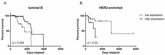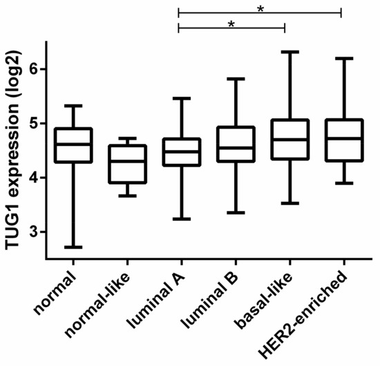2.1. TUG1 Expression Is Increased in HER2-Enriched and Basal-Like Compared to Luminal A