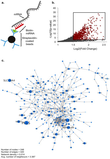 SH-SY5Y cells purchased from Sigma-Aldrich (Sydney, Australia) were transfected in triplicate with 600 pmoles of single-stranded biotinylated–miR-210-3p mimic (bi-miR-210) (GenePharma, Shanghai, China; 5’CUGUGCGUGUGACAGCGGCUGA–biotin, accession: MIMAT0000267) or bi-miR-239b-5p mimic (Genepharma; 5’UUUGUACUACACAAAAGUACUG–biotin, accession: MIMAT00 00295). Then 150 µL of Dynabeads M-280 streptavidin was prepared for RNA manipulation according to the manufacturer’s directions. Beads were blocked overnight on rotation at 4 °C with 1 mg/mL yeast transfer RNA (tRNA) and 1 mg/mL bovine serum albumin (BSA). After 24 h, cells were trypsinized, spun down, and washed twice in ice-cold phosphate-buffered saline (PBS) before being lysed on ice for 30 min in cell lysis buffer containing 10 mM Tris-HCl (pH 7.5), 10 mM KCl, 1.5 mM MgCl2, 5 mM dithiothreitol (DTT), 0.5% IGEPAL CA-630, 50 U/mL RNase Out, and 1× complete mini-protease inhibitor cocktail (Roche, Sydney, Australia). Blocked beads were washed and resuspended in 450 µL of wash buffer (lysis buffer with NaCl adjusted to 1 M). Lysates were cleared at 5000× g for 5 min at 4 °C, and supernatant was removed and adjusted to 1 M NaCl/450 µL. Cell lysate was incubated with beads on rotation for 30 min at room temperature and subsequently washed 3 times in wash buffer before being resuspended in 250 µL of RNAse/DNase free water.