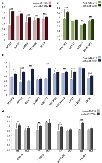 As miRNAs are known to primarily target genes through 3′-UTRs, primers flanking these regions were designed for 19 selected genes of interest and whole 3′-UTRs were amplified and cloned into the ΨCheck2 vector backbone. To assay luciferase activity, the Cos-7 cell line, derived from African green monkey kidneys, was chosen as a readily transfected cell system that possesses mammalian RISC components required for assessing miRNA functionality. The primate miRNA genome also displays significant diversification from the human, so utilizing a primate cell line may potentially reduce background noise from endogenous regulatory factors [48]. To assay gene regulation, constructs were transfected into the mammalian Cos-7 cell line either alone or co-transfected with hsa-miR-210 mimic or cel-miR-239b negative control mimic. Luciferase expression was measured after 24 h and all data were normalized to native ΨCheck2 vector samples to account for effects of mimic transfection and potential interactions with foreign sequences in the ΨCheck2 vector before normalizing data for individual constructs to plasmid-only transfected samples. From this we found that the majority of genes we tested (17/19, >89%) were significantly downregulated by miR-210 through their respective 3′-UTRs (Figure 2). Significantly regulated genes associated with neuronal/synaptic plasticity included those mentioned previously among the top enriched target genes from pull-down data (GRINA, AP2S1, and TMUB1) as well as the OXPHOS-related ATP6V0C, a subunit of vacuolar ATPase (v-ATPase), involved in synaptic vesicle function, and the actin subunit ACTB, whose homolog was also identified as a potential target of miR-210 in the honeybee (Table 1, Figure 2a) [6,49]. MAPK/VEGF signaling-related genes EIF4EBP1, VEGFB, and MAP2K2 as well as numerous neurodegenerative-related genes were also validated as significantly regulated by miR-210, including OXPHOS genes (ATP5G2, ATP5D, COX8A, COX6A1, NDUFS7, NDUFS8, NDUFA4L2, and CYC1) and the apolipoprotein E gene, APOE, the major genetic risk factor for AD (Figure 2b,c) [50]. To confirm the specificity of luciferase assays, we also looked for predicted miR-210 recognition elements (MREs) in 3′-UTRs of significantly downregulated genes of interest. We identified four MREs using the hybridization-based algorithm RNAHybrid in 3′-UTRs of GRINA, VEGFB, ATP6V0C, and TMUB1 (Figure S4). MRE constructs were assayed alongside mutant MREs with G/C>A point mutations introduced in binding regions, and we confirmed that downregulation by miR-210 through these MREs was disrupted by mutating these sites (Figure 2d,e). This suggests that the majority of gene targets identified through our biotin pull-down approach are genuine regulatory targets and that miR-210 may regulate a number of key genes involved with neuronal function and neurodegeneration.