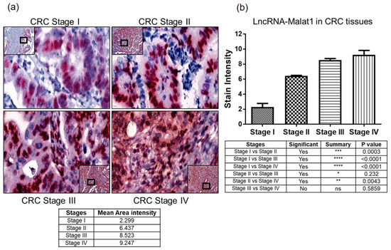 - Zheng, H.T.; Shi, D.B.; Wang, Y.W.; Li, X.X.; Xu, Y.; Tripathi, P.; Gu, W.L.; Cai, G.X.; Cai, S.J. High expression of lncRNA MALAT1 suggests a biomarker of poor prognosis in colorectal cancer. Int. J. Clin. Exp. Pathol. 2014, 7, 3174–3181. [Google Scholar] [PubMed]