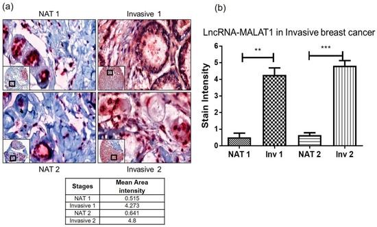 - Zhang, Z.; Weaver, D.L.; Olsen, D.; Peng, Z.; Ashikaga, T.; Evans, M.F. Long non-coding RNA chromogenic in situ hybridisation signal pattern correlation with breast tumour pathology. J. Clin. Pathol. 2016, 69, 76–81. [Google Scholar] [CrossRef] [PubMed]