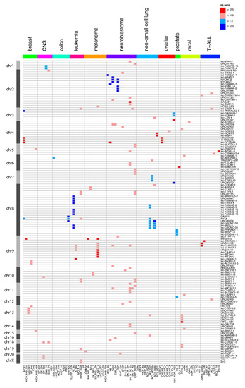 Overview of the long non-coding RNA (lncRNA) genes affected by focal somatic copy-number alterations (SCNAs) after extensive filtering. Red represents the copy number loss (log-ratio < 1.5) in that cell line, while blue corresponds to copy number gain (log-ratio > 1.5). Dark red and blue correspond to copy number changes with absolute log-ratios of above 2.5.