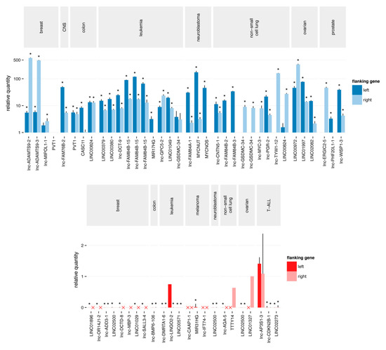 - Lanzós, A.; Carlevaro-Fita, J.; Mularoni, L.; Reverter, F.; Palumbo, E.; Guigó, R.; Johnson, R. Discovery of cancer driver long noncoding RNAs across 1112 tumour genomes: New candidates and distinguishing features. Sci. Rep. 2017, 7, 41544. [Google Scholar] [CrossRef] [PubMed]