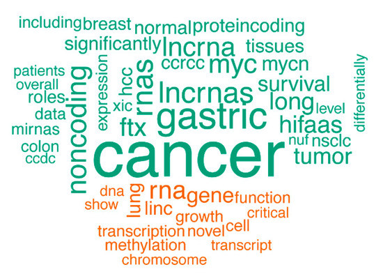 A comparison word cloud shows strong enrichment of the word “cancer” in abstracts of publications associated with the lncRNAs affected by SCNAs. The size of each word corresponds to the deviation of its frequency in abstracts associated with the lncRNAs affected by SCNAs from the average occurrence frequency. Green words are more prevalent in abstracts on lncRNAs affected by SCNAs, while orange words are more prevalent in the abstracts on lncRNAs unaffected by SCNAs.