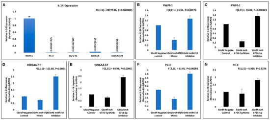 miR-4719 and miR-6756-5p targets IL-24. qRT-PCR experiments were performed in quadruplicates. (A–G) Effects of 50 nM concentration of microRNA mimics and inhibitors of miR-4719 and miR-6756-5p on IL-24 mRNA expression in the RWPE-1, PC-3 and the E006AA-hT PCa cell lines. Data are presented as mean ± standard error of the mean. Statistical differences were determined with one-way ANOVA. All the criterions for significance was set at p < 0.05.