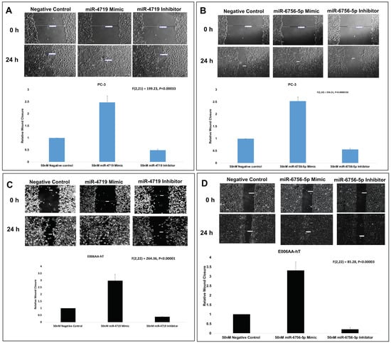 Lastly, wound healing assays were performed to assess effect of the mimics and inhibitors of miR-4719 and miR-6756-5p on migration of the CRPC PC-3 and E006AA-hT cell lines (Figure 4). Wound healing assays reveal that inhibition of miR-4719 and miR-6756-5p reduced migration by approximately 50% compared to the negative control of the CM cell line, PC-3 (Figure 4A,B). We observed that inhibition of miR-4719 and miR-6756-5p more effectively reduced the migration of CRPC E006AA-hT cells compared to the negative control, by ~60% and ~80%, respectively (Figure 4C,D). Strikingly, overexpression of miR-4719 and miR-6756-5p increased the migratory capacity of both CRPC cell lines, in PC-3 by greater than 2-fold and in E006AA-hT by at least 3-fold (Figure 4A–D). Taken together, loss of miR-4719 and miR-6756-5p inhibited proliferation and migration in CRPC cell lines.