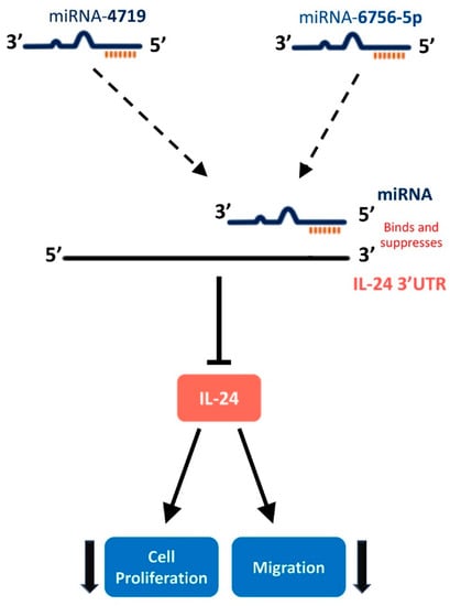 Hypothesized pathway of microRNA-4719 and microRNA-6756-5p targeting IL-24 to regulate cellular proliferation and migration in CRPC cell lines. miR-4719 and miR-6756-5p bind to IL-24 3′UTR leading to destabilization of IL-2 mRNA, a decrease in IL-24 protein production, and an increase in CRPC cell proliferation and migration.