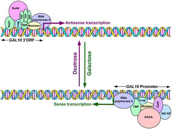 Figure 1. Schematic diagram showing GAL10 sense and antisense transcriptions in galactose and dextrose-containing growth media, respectively. Bottom panel: The activator, Gal4, targets the co-activator, SAGA, to the GAL10 upstream activating sequence to enhance the formation of PIC, via the Mediator complex, independent of the TAFs that initiate GAL10 sense transcription a in galactose-containing growth medium [,]. The 19S proteasome subcomplex, or 19S RP, enhances the targeting of SAGA to Gal4 independent of the proteolytic activity of the 26S proteasome []. Top panel: Reb1 targets NuA4 KAT to the 3′-end of the GAL10 coding sequence (GAL10 3′ORF) for histone H4 acetylation and targeting of RNA polymerase II, via TFIID, to initiate GAL10 antisense transcription in dextrose-containing growth medium [,]. PIC—pre-initiation complex; SAGA—Spt-Ada-Gcn5-Acetyltransferase; TBP—TATA-box binding proteins; TAFs—TBP-associated factors; NuA4—Nucleosome acetyltransferase of histone H4; TFIID—Transcription factor IID, a complex of TBPs and a set of TAFs; TFIIB—Transcription factor IIB; and 19S RP—19S regulatory particle.