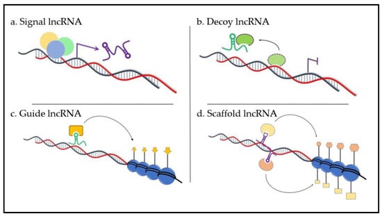 Despite new studies of lncRNAs, it is still not known whether all existing lncRNAs have a function. However, it is probable that the majority of lncRNAs are functionally relevant, although heterogeneous in their mode of action. Commonly, the diverse functions of lncRNAs can be divided into four archetypes of molecular mechanisms (Figure 1). Nevertheless, one lncRNA may fulfill several archetypes [].