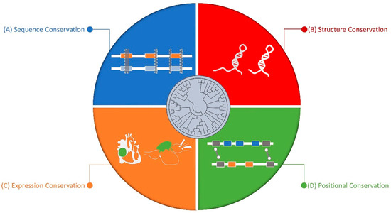 Dimensions of long non-coding RNA (lncRNA) conservation: (A) Sequence Conservation: sequence homology or/and conserved gene structures across different organisms. (B) Structure Conservation: lncRNAs can form conserved secondary or tertiary structure. (C) Expression Conservation: the expression patterns of lncRNA can be spatio-temporally conserved across species. (D) Positional Conservation: the syntenic location of lncRNA with respect to its neighboring genes is conserved across species.