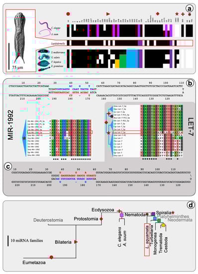 - Fromm, B.; Worren, M.M.; Hahn, C.; Hovig, E.; Bachmann, L. Substantial loss of conserved and gain of novel MicroRNA families in flatworms. Mol. Biol. Evol. 2013, 30, 2619–2628. [Google Scholar] [CrossRef] [PubMed]