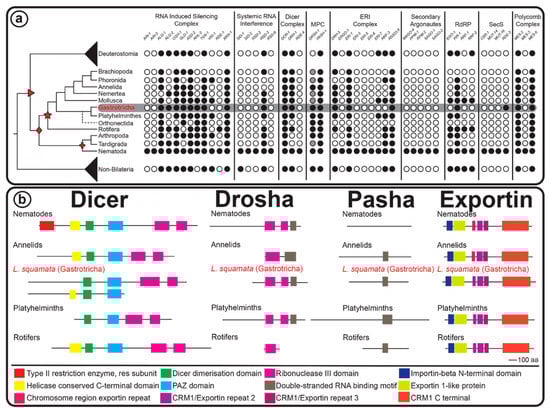 miRNA & piRNA biogenesis proteins and RNAi machinery. (a) distribution of RNAi proteins across animals. The cladogram to the left indicates the currently accepted phylogenetic relationships among animal taxa [,,,,], and drawings on particular nodes are according to Figure 1d. Black circles denote the presence of proteins from different small RNA complexes, while white circles illustrates protein absence, and grey circles represent a deduced, but not actually detected presence of Drosha based on the presence of bona fide miRNAs. A protein is categorized as present whether we could find it in at least one species from each phylogenetic group. See Supplementary Table S2 for detailed description of presence/absence of RNAi proteins). Gene names at the top are based on C. elegans gene nomenclature. Abbreviations: MPC = Microprocessor Complex; RdRP = RNA dependent RNA polymerases; and SecS = Secondary RNAi Silencing. (b) Domain composition of miRNA proteins among selected spiralian and nematode species. The domain composition of Dicer, Drosha, Pasha, and Exportin discovered by reciprocal Blast searches were annotated using Pfam database []. All proteins are from genome-derived predicted proteins, except for L. squamata. Hence, some proteins might be not full-length due to incomplete assembly.