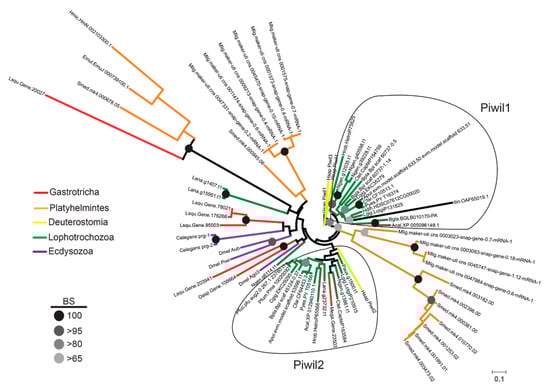 Phylogenetic analysis of PIWI-like proteins. Maximum likelihood analysis of protostome PIWI-like proteins with gastrotrich counterparts highlighted in red. Bootstrap values of particular clades are represented as black-to-grey circles as shown on the lower left. The scale bar on the lower right indicates amino acid substitution rate per site. Color coding on tree branches is shown as follows: Red = gastrotrichs; orange = platyhelminths; yellow = deuterostomes, specifically human PIWI proteins; green = lophotrochozoans (comprising annelids, mollusks, nemerteans, brachiopods, and phoronids); and violet = ecdysozoans (C. elegans and D. melanogaster).