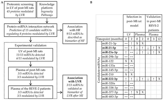Identification of miR-21-5p, miR-23a-3p and miR-222-3p to detect left ventricular remodeling (LVR) after myocardial infarction (MI) and to predict heart failure (HF). (A) Design and (B) experimental selection and validation of the 13 candidate miRNAs predicted from the proteomic data obtained in LV of post-MI rats by the Ingenuity Pathway knowledge platform. Quantification of candidate miRNAs in LV and in plasma of post-MI rats at 7 days (Timepoint 0) and at 2 months and in plasma of REVE-2 patients at baseline (Timepoint 0), 3 month and 12 months after MI was published elsewhere []. ↑ and ↓ respectively indicate a significant increase and decrease of miRNAs (p < 0.05) detected between sham- and post-MI rats/between patients with no and high LVR, ↔ indicates no modulation, X indicates a lack of detection. MiRNAs remaining after the validation process are in bold.