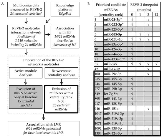 Identification of miR-21-5p, miR-222-3p, miR-335-5p, miR-26ba-3p, miR-375 and miR-17-5p to detect left ventricular remodeling (LVR) after myocardial infarction (MI) and to predict heart failure (HF). (A) Selection process and (B) priorization analysis of the 24 miRNAs predicted from the multi-omic data obtained in the 226 patients from the REVE-2 study by the EdgeBox knowledge platform. √ indicates that miRNA is predicted to be active at the corresponding timepoint: baseline (0), 1 month, 3 month and 12 months after MI. MiRNAs only active at baseline (grey) and with a betweenness centrality rank lower than 50 (inside the thick line) were excluded from further investigation because they are not expected to be highly involved in LVR after MI. * indicates REVE-2 variables. MiRNAs remaining after the selection process are in bold.