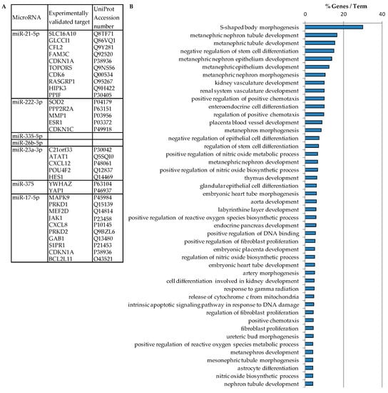 Functional annotation enrichment analysis of the 7 miRNA’s targets. (A) Targets of miRNAs were predicted by miRecords database. No targets have been described for miR-335-5p and miR-26b-5p. (B) Biological processes of miRNA’s target genes were predicted by Cytoscape plugin ClueGO and Cluepedia applications (p < 0.05).