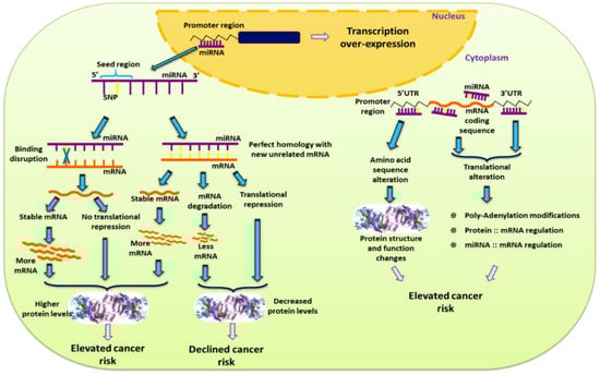 miR-SNPs located in regulatory regions of genes, at miRNA binding sites, or at quantitative trait loci play a major role in gene function and phenotype (Figure 1). Such miR-SNPs can lead to increased risk of multiple types of cancer, including breast cancer []. miR-SNPs in seed regions of miRNAs (regions responsible for miRNA-mRNA binding) can disrupt miRNA binding or be lethal. In addition, by altering sequence homology, SNPs can create new interactions between miRNA seed regions and target mRNA [] (Figure 1). miR-SNPs in the 3′UTRs of mRNA can alter polyadenylation, protein-mRNA interactions, and miRNA-mRNA interactions. These changes can have significant effects on mRNA stability and translation efficiency []. Similarly, SNPs in miRNA sequences, including primary and precursor miRNA sequences, can affect production or stability of these miRNAs, as well as miRNA-mRNA interactions, leading to changes in the expression of miRNA target genes []. Changes in miRNAs and their mRNA interactions can also be mediated by alterations to miRNA biogenesis genes, which can be brought about by SNPs in proteins responsible for miRNA processing after transcription [,]. All of these types of miR-SNP can be prospective candidates as biomarkers for detecting disease susceptibility, determining prognosis for personalized therapeutic regimens, and ensuring the best clinical management of breast cancer patients [,,,,]. In this review, we will discuss miR-SNPs found to be important in breast cancer.