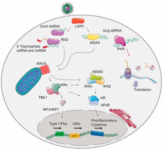 The presence of cytoplasmic virus-derived RNA is detected by a family of receptors called RIG-I-like receptors (RLRs), which include retinoic-acid-inducible protein 1 (RIG-I), melanoma-differentiation-associated gene 5 (MDA5), laboratory of genetics physiology 2 (LGP2), and signals through the mitochondrial antiviral-signaling protein (MAVS). Activation of RLR-signaling by recognition of virus-derived RNAs also results in type I IFNs and proinflammatory cytokine expression and this, in turn, increases expression of RLRs since these are also ISGs [25,26].