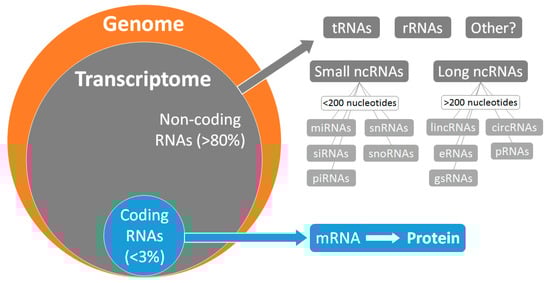 Environmental factors, such as those mentioned above, can affect gene expression, which is reflected by the transcriptome. For many years, there was an emphasis on the study of protein-coding genes giving rise to messenger RNA (mRNA). More recently, the emergence of non-coding RNA genes (ncRNA) has allowed the scientific community to appreciate the full complexity of the transcriptome. The discovery of various new classes of RNAs and their different functions has had profound implications for molecular biology and medical research (Figure 1). The importance of ncRNAs in physiological and pathological processes, such as CVD, has been frequently reinforced, and they have major regulatory roles in gene expression [,]. Thus, understanding the interactions between the different types of RNA, both coding and non-coding, and how they affect gene expression in CVD, is necessary to forward CVD management.