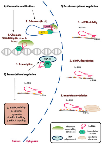 Biological functions of lncRNAs. LncRNAs were shown to interact with protein coding genes and their transcripts to regulate gene expression. (A) Nuclear lncRNAs interact with chromatin remodelling factors and TFs to regulate the expression of neighbouring or distal genes. (B) Nuclear lncRNAs also regulate transcription and several other transcriptional events of RNA processing. (C) Cytoplasmic lncRNAs were shown to interfere with post-transcriptional regulation such as mRNA stability and degradation as well as translational regulation of mRNAs.