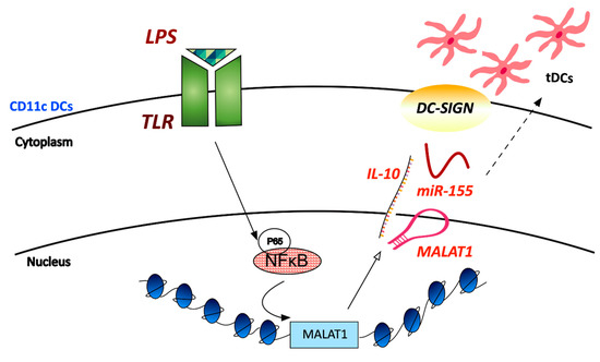 Expression of MALAT1 is increased in response to inflammatory stimuli in CD11c+ cells of tolerized allograft cardiac tissue. LPS-induced transcription of MALAT1 was shown to be dependent on the p65- associated activation of the NF-κB pathway and to increase secretion of the immunosuppressive cytokine IL-10. DC-SIGN (dendritic cell- specific intercellular adhesion molecule-3 grabbing nonintegrin) was also shown to be controlled by MALAT1 and to act as a miR-155 sponge to maintain the tolerogenic ability of the tDCs (tolerogenic DCs).