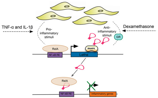 Lethe regulates gene expression upon exposure to TNF-α, IL-1β and dexamethasone in fibroblasts. Activation of Lethe by either pro- or anti-inflammatory stimuli was found to inhibit expression of inflammatory genes by binding directly to RelA and preventing NF-κB binding to DNA. Therefore, Lethe is suggested to act as a negative regulator of NF-κB and the activation of the inflammatory response. GR, glucocorticoid receptor; NF-κB RE, NF-κB response element; RelA, transcription factor p65.