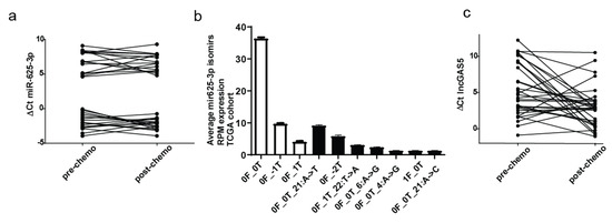 Analysis [24] of an independent cohort of small RNA-seq data derived from mesothelioma samples from untreated patients generated by The Cancer Genome Atlas (TCGA) not only confirmed the presence of these miR-625-3p isomiRs detected in circulation (Figure 1b) as well as revealed that altogether miR-625-3p isomiRs counts are abundant in mesothelioma tissue.